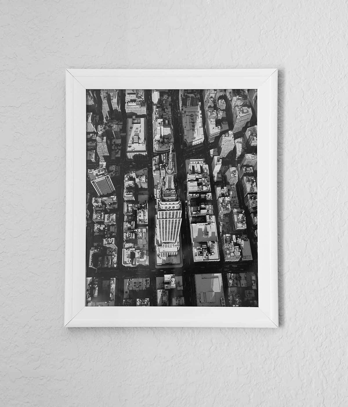 Capture the timeless grandeur of New York with this striking black-and-white print of the Empire State Building. Taken from a unique aerial perspective, this piece is a perfect tribute to urban architecture and a stunning addition to any modern space.