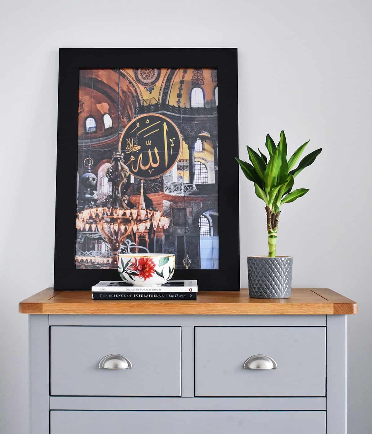 Celebrate the rich beauty of Islamic architecture and art with this stunning framed print. Featuring intricate details of a mosque interior and elegant Arabic calligraphy, this piece brings a sense of serenity and grandeur to any space.